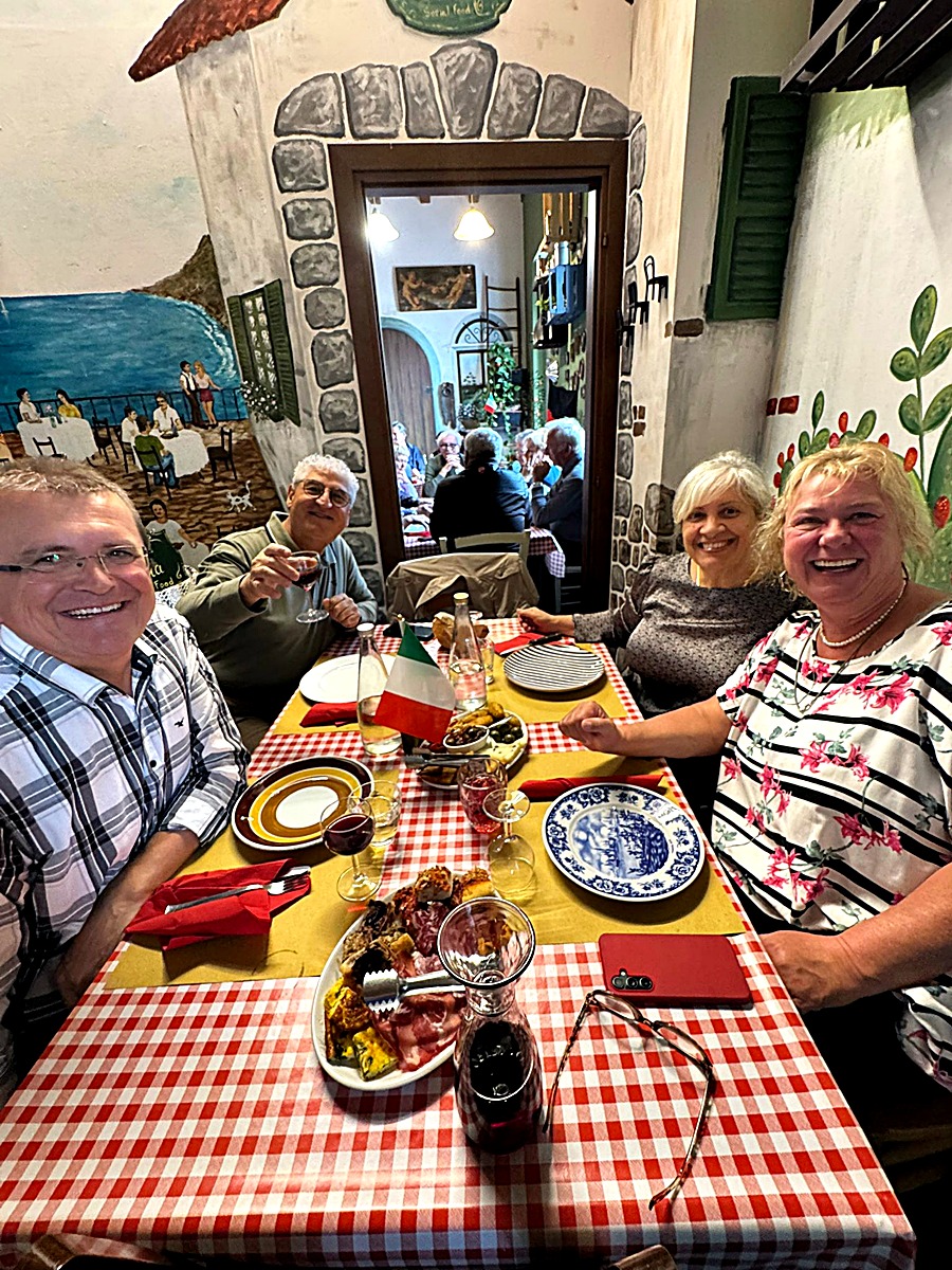Am Abend kehrte die Gruppe nach Mezzago zurück, wo ein festliches Abendessen auf dem Programm stand. In einem gemütlichen Restaurant wurde bei Fischspezialitäten, Meerestieren, Wein und Gesang ein langer, geselliger Abend verbracht, der noch lange in Erinnerung bleiben wird.